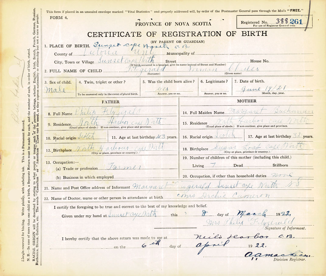 21. Name and Post Office address of Informant Margaret Fitzgerald Sunset ,Cape North