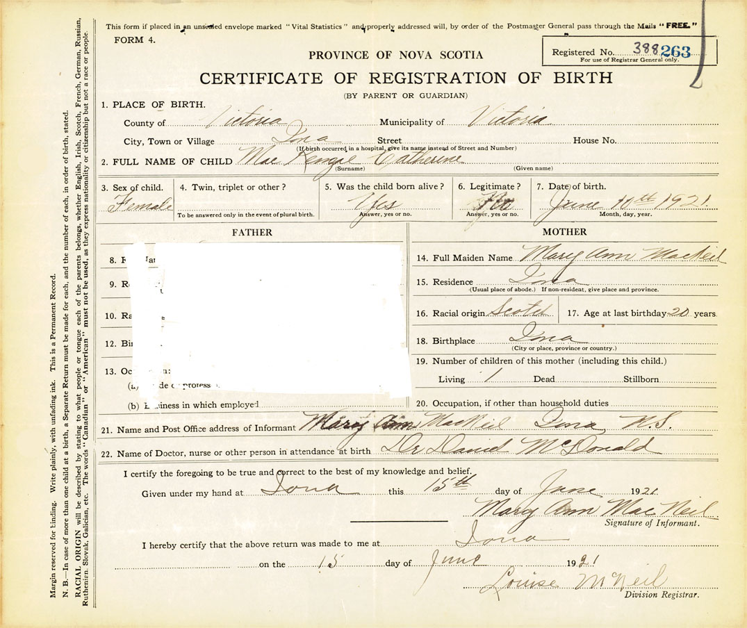 21. Name and Post Office address of Informant Mary Ann MacNeil Iona