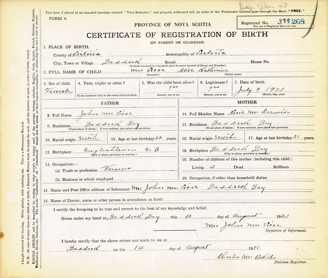21. Name and Post Office address of Informant Mrs. John MacVicar Baddeck Bay