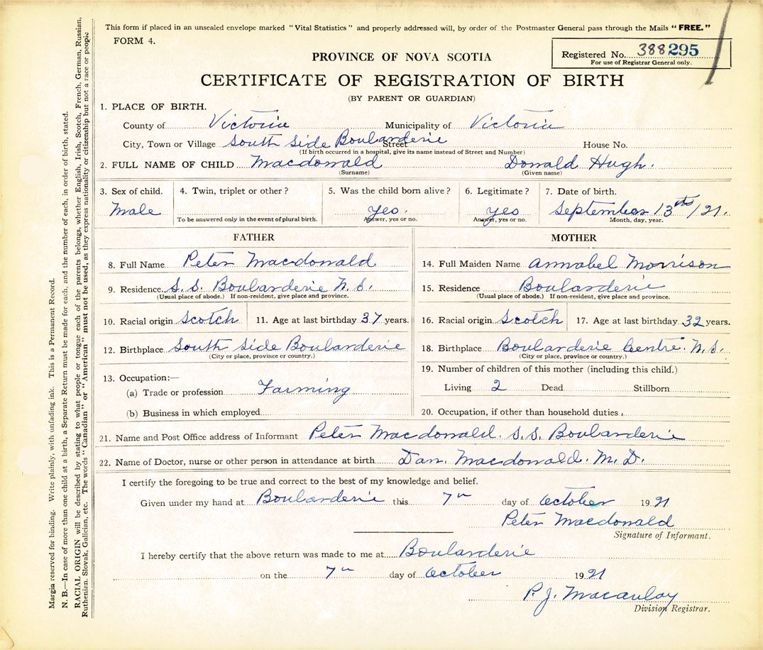 21. Name and Post Office address of Informant Peter Macdonald S. S. Boularderie