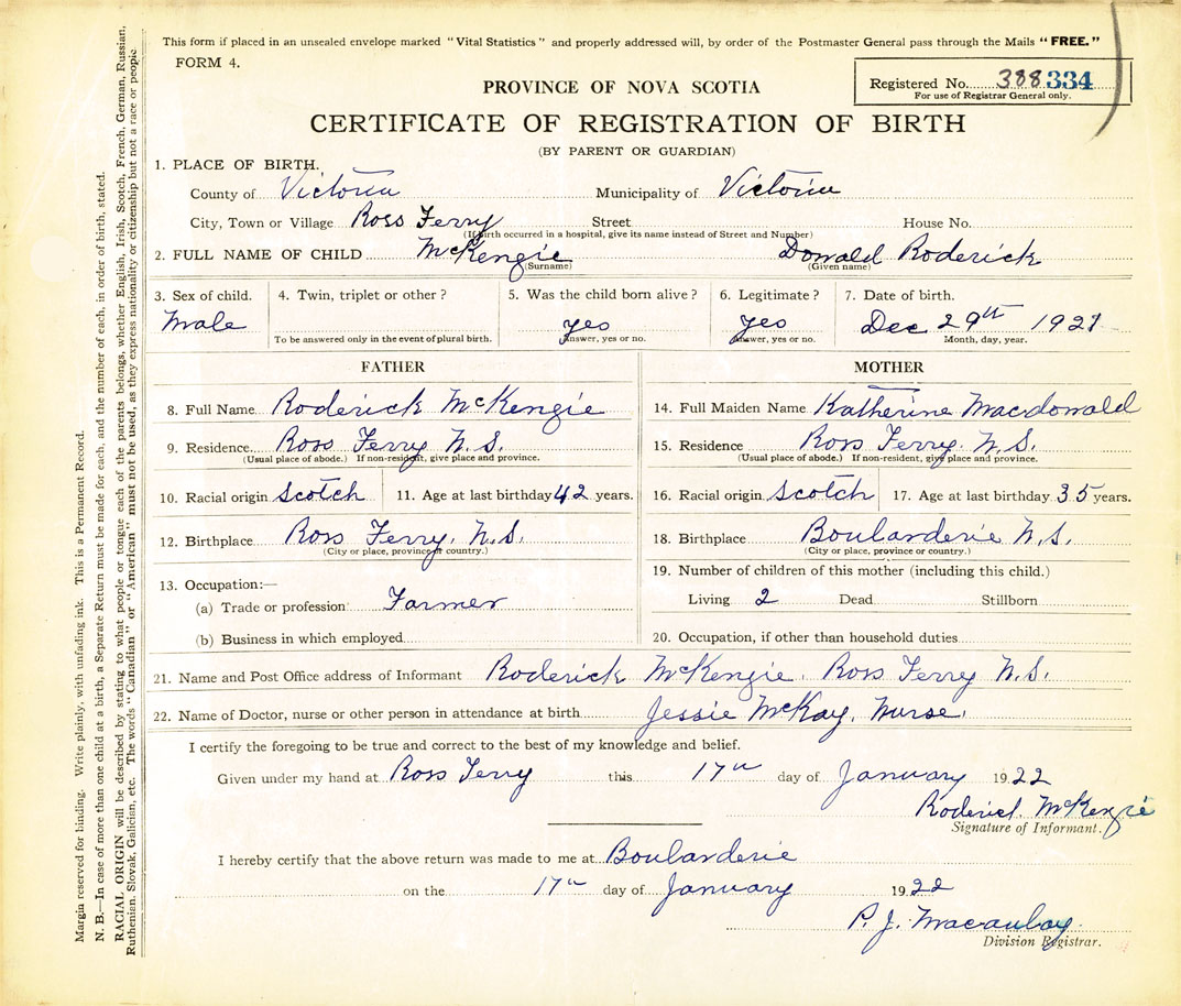 21. Name and Post Office address of Informant Roderick McKenzie Ross Ferry