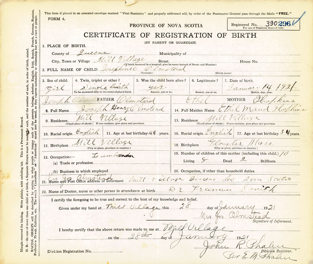 21. Name and Post Office address of Informant Mrs. Jos. Olmstead Mill Village, Queens