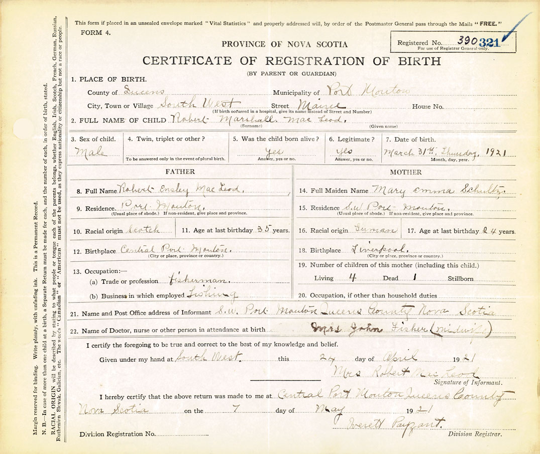 21. Name and Post Office address of Informant Mrs. Robert MacLeod S. W. Port Mouton, Queens County