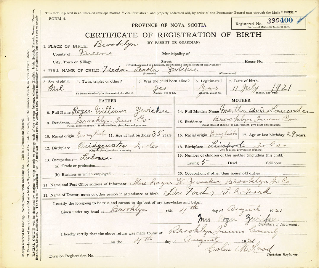 21. Name and Post Office address of Informant Mrs. Roger W. Zwicker Brooklyn, Q.