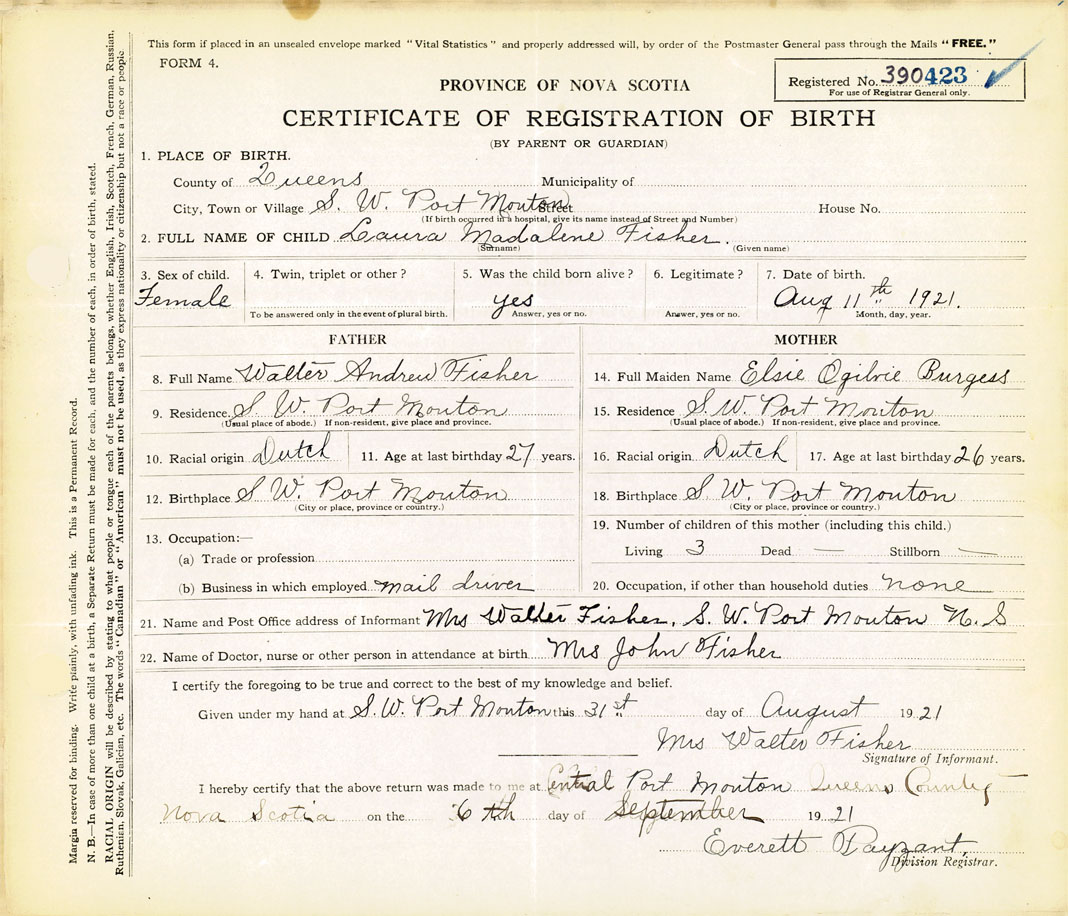 21. Name and Post Office address of Informant Mrs. Walter Fisher S.W. Port Mouton