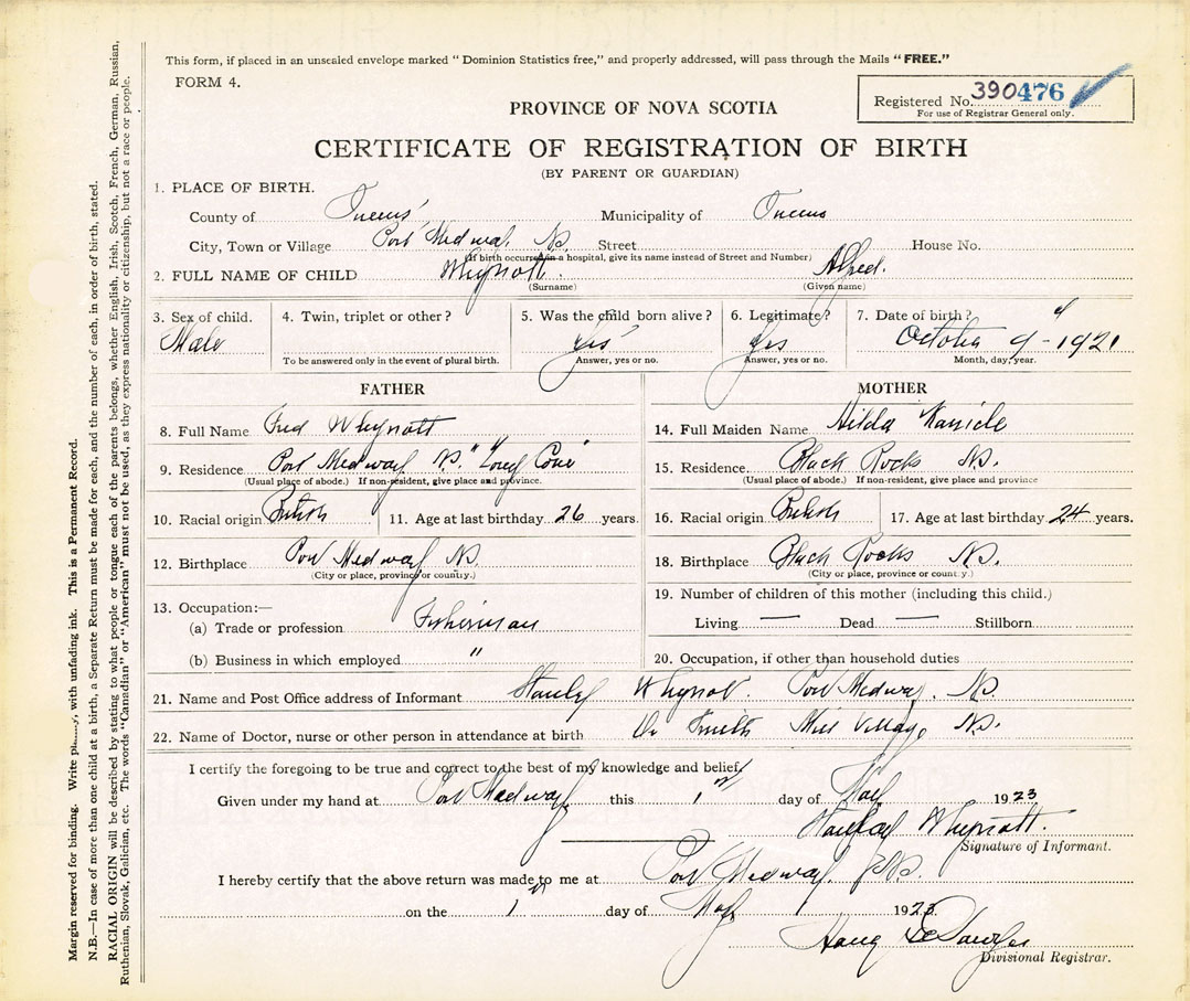 12. Birthplace Port Medway N.S.