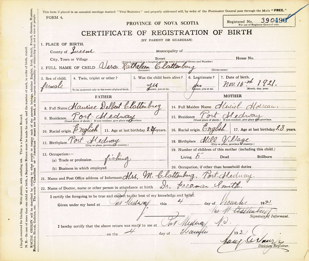 21. Name and Post Office address of Informant Mrs. M. Clattenburg Port Medway