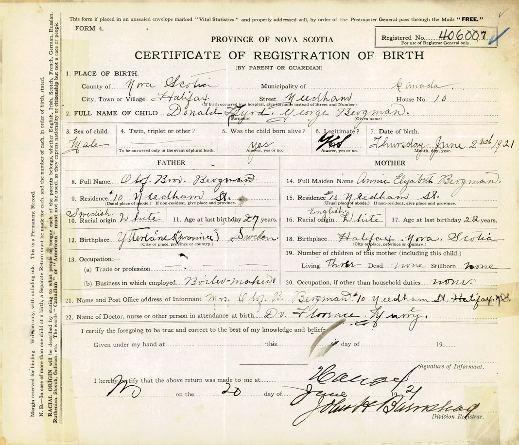 21. Name and Post Office address of Informant Mrs. Olof B. Bergman 10 Needham St., Halifax