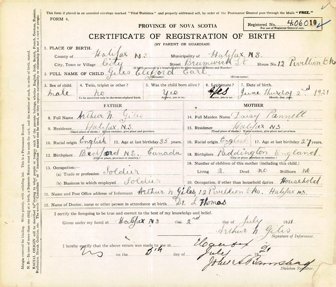 21. Name and Post Office address of Informant Arthur N. Giles 12 Pavillion Bks., Halifax