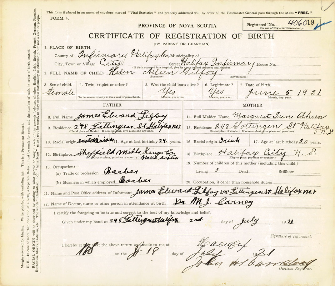 21. Name and Post Office address of Informant James Edward Gilfoy 248 Gottingen St., Halifax