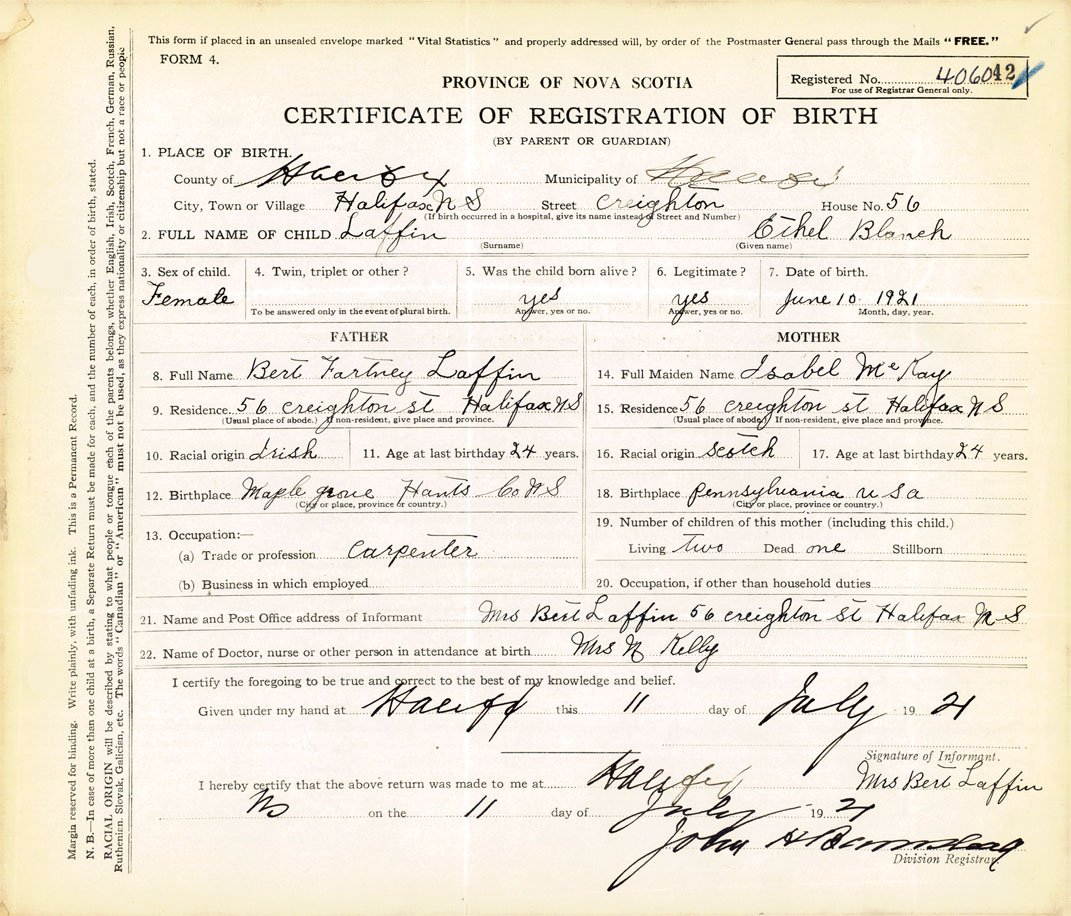 21. Name and Post Office address of Informant Mrs. Bert Laffin 56 Creighton St., Halifax