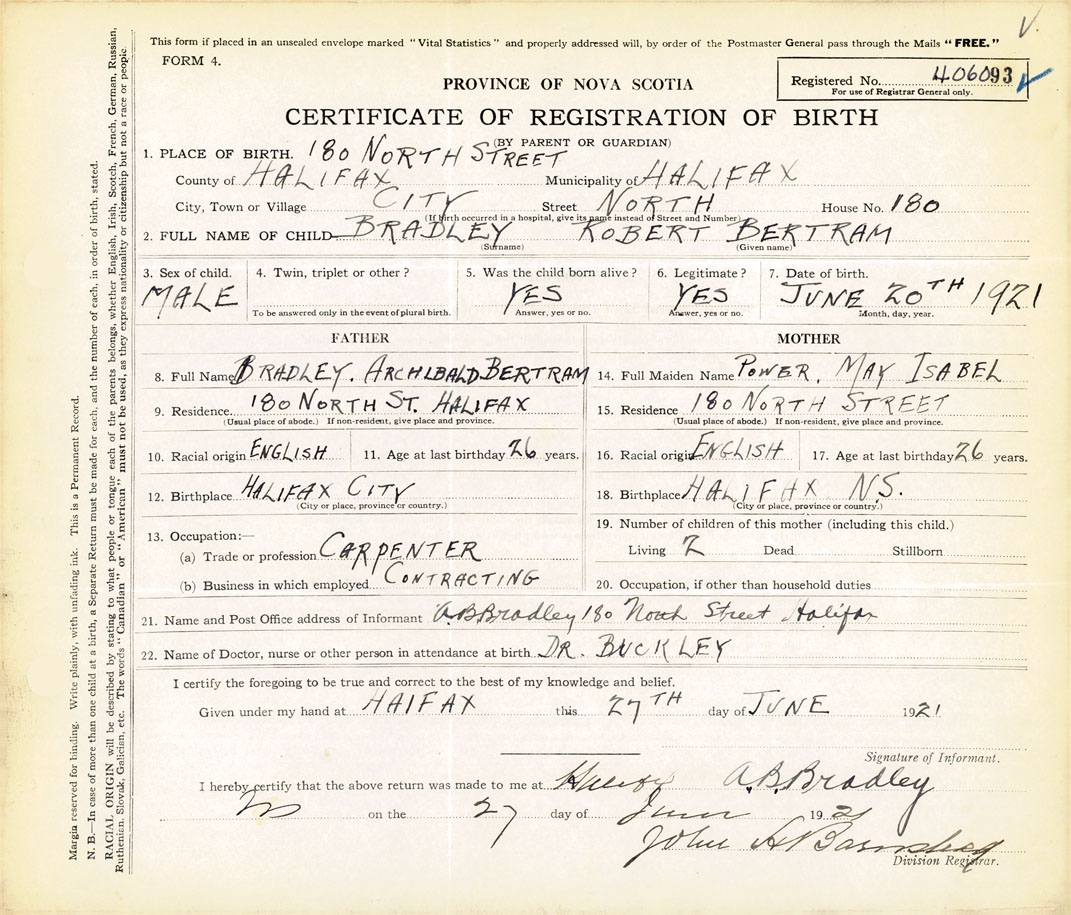 21. Name and Post Office address of Informant A. B. Bradley 130 North Street, Halifax