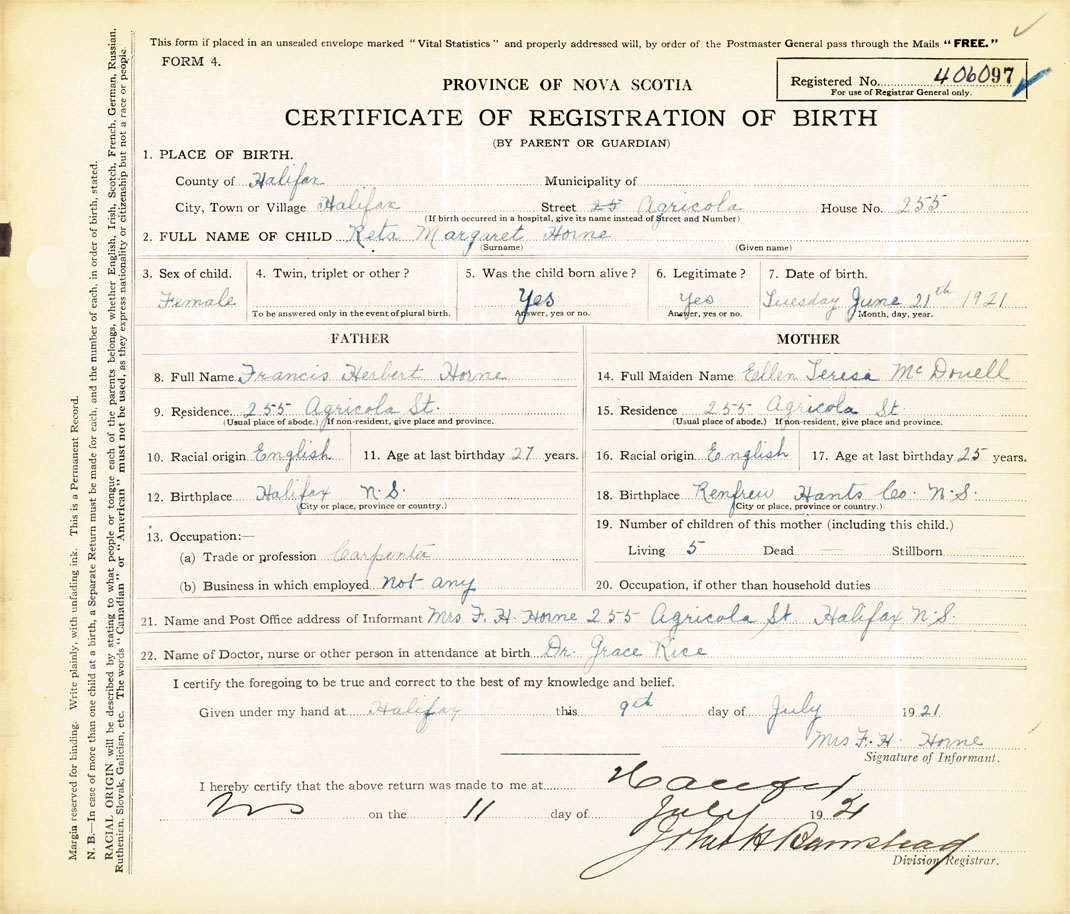 21. Name and Post Office address of Informant Mrs. F. H. Horne 255 Agricola St., Halifax