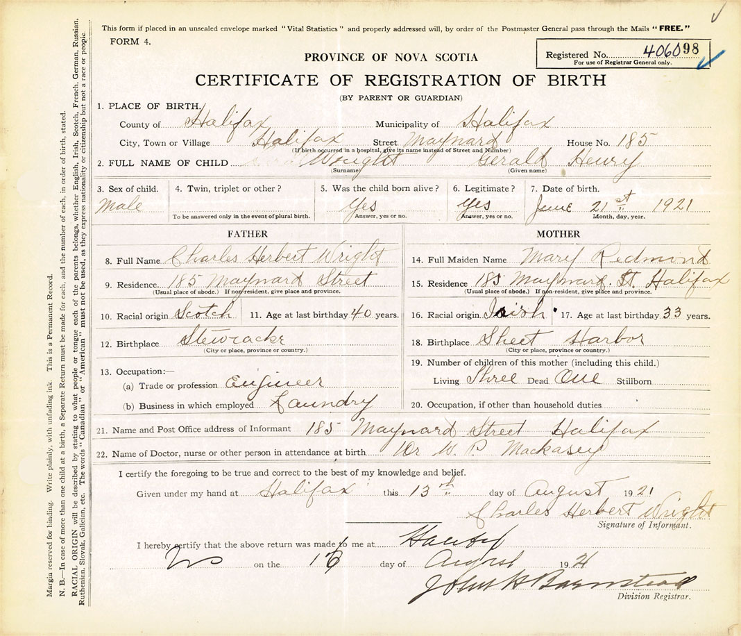 21. Name and Post Office address of Informant Charles Herbert Wright 185 Maynard Street, Halifax