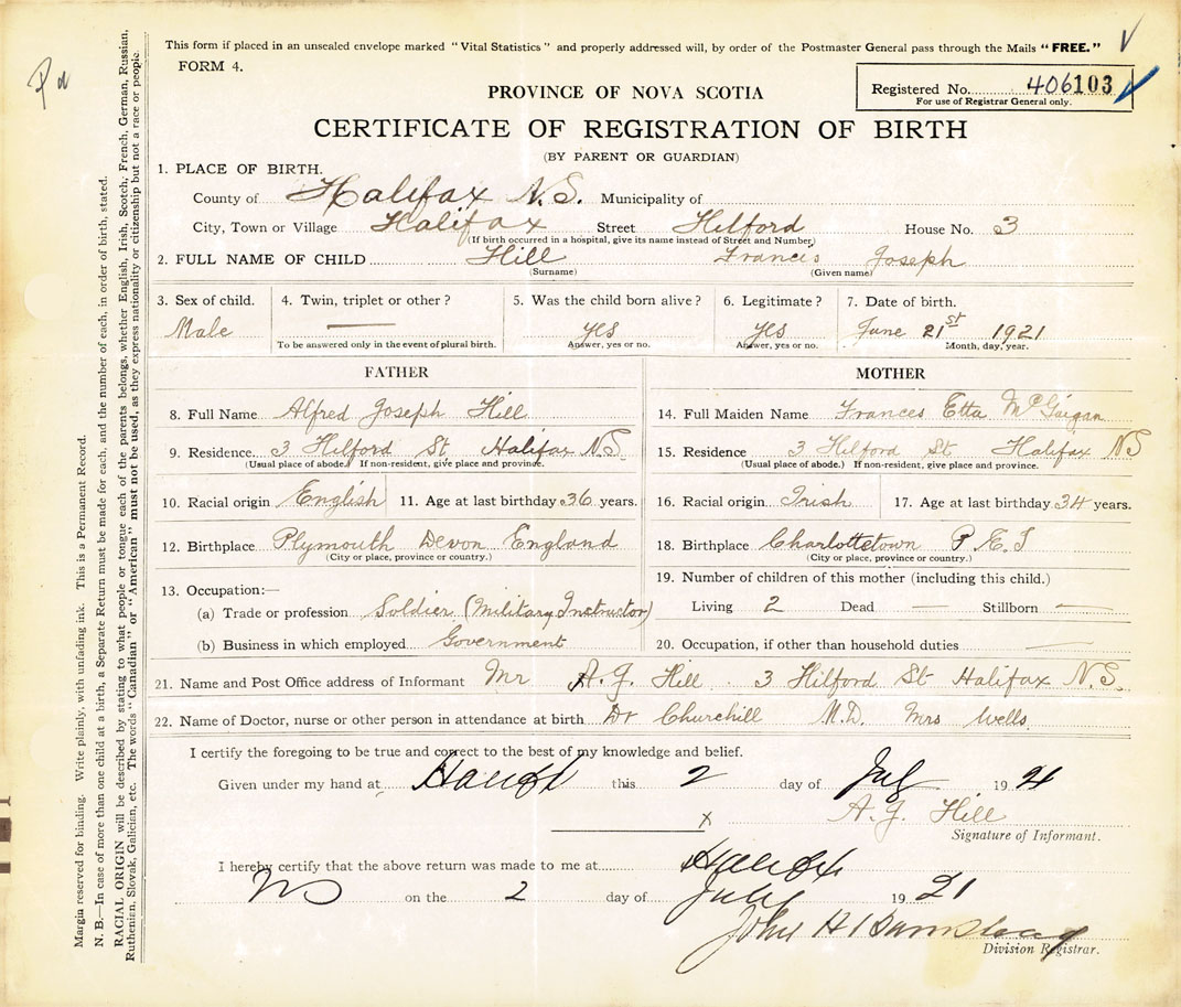 21. Name and Post Office address of Informant Mr. A.G. Hill 3 Hilford St., Halifax