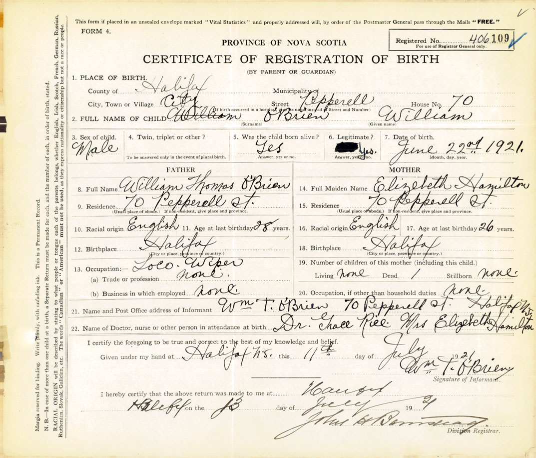 21. Name and Post Office address of Informant Wm. T. O'Brien 70 Pepperell St., Halifax