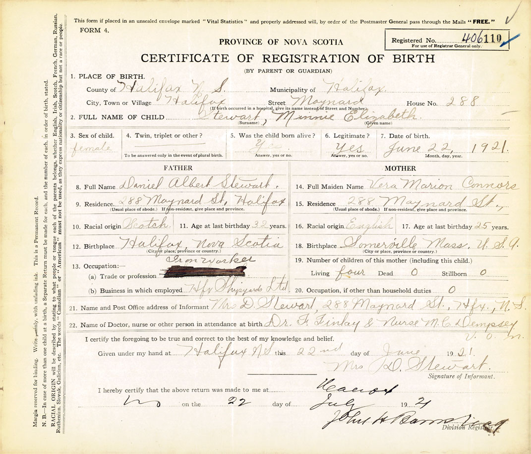21. Name and Post Office address of Informant Mrs. D. Stewart 288 Maynard St., Halifax