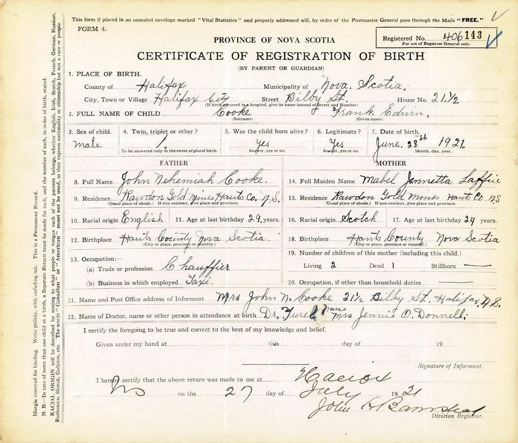 21. Name and Post Office address of Informant Mrs. John N. Cooke 21 1/2 Bilby St., Halifax