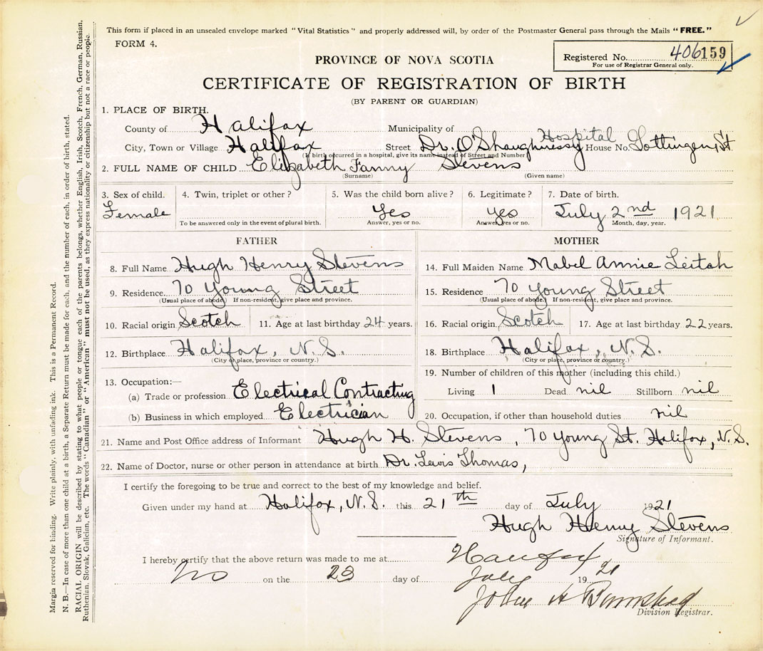 21. Name and Post Office address of Informant Hugh Henry Stevens 70 Young St., Halifax