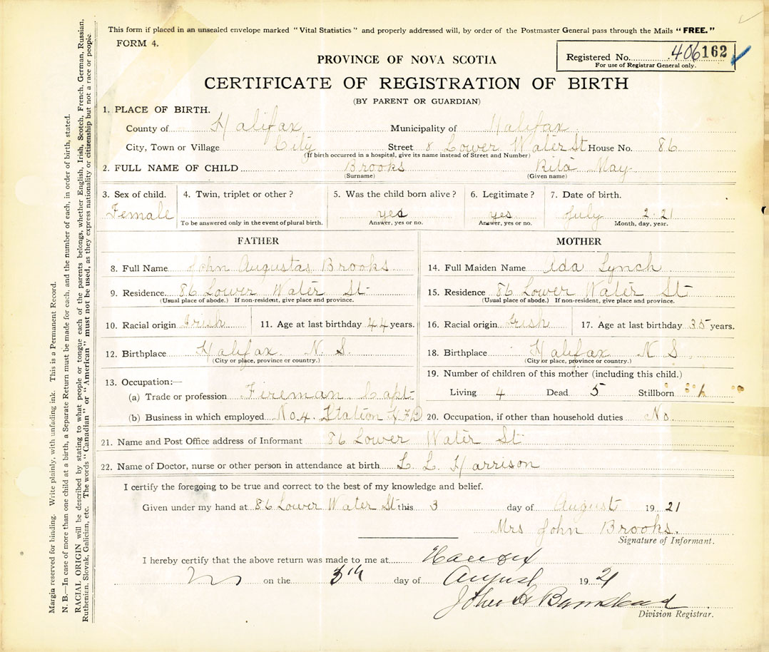 21. Name and Post Office address of Informant Mrs. John Brooks 86 Lower Water St. Halifax