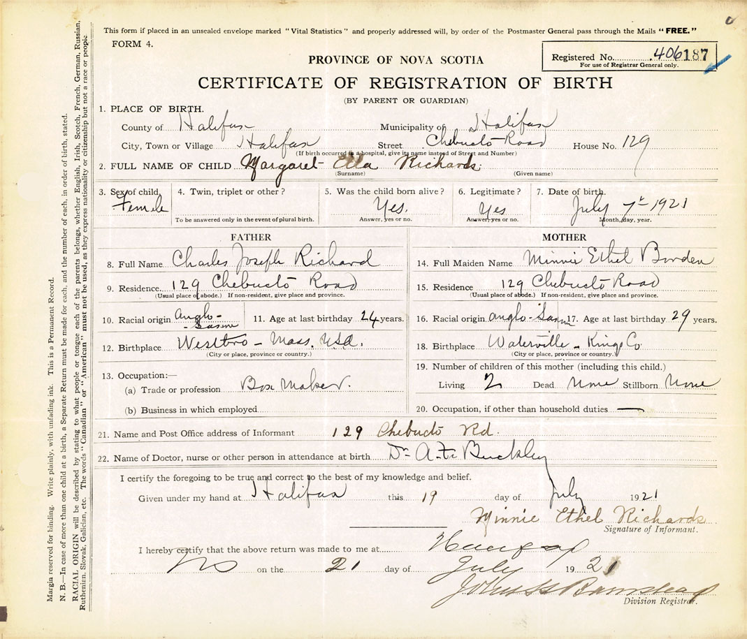 21. Name and Post Office address of Informant Minnie Ethel Richards 129 Chebucto Rd.