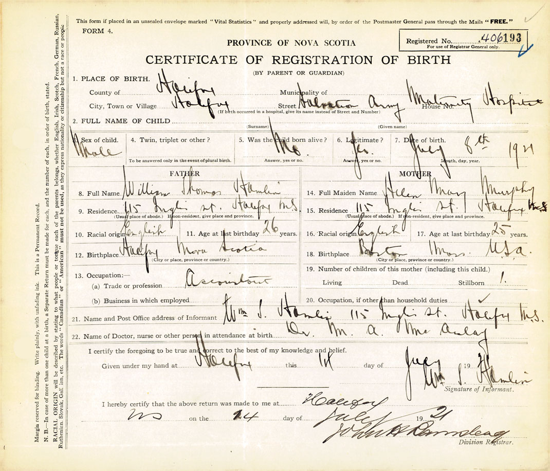 21. Name and Post Office address of Informant Wm. T. Hamlin 115 Inglis St., Halifax