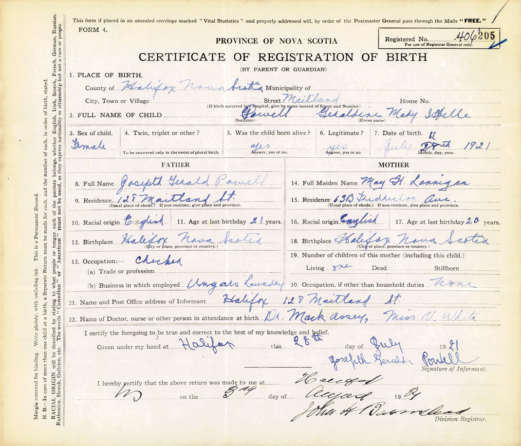 21. Name and Post Office address of Informant Josepth Gerald Powell 128 Maitland St., Halifax