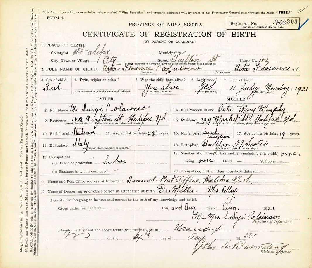 21. Name and Post Office address of Informant Mr. & Mrs. Luigi Colaiocco General Post Office, Halifax