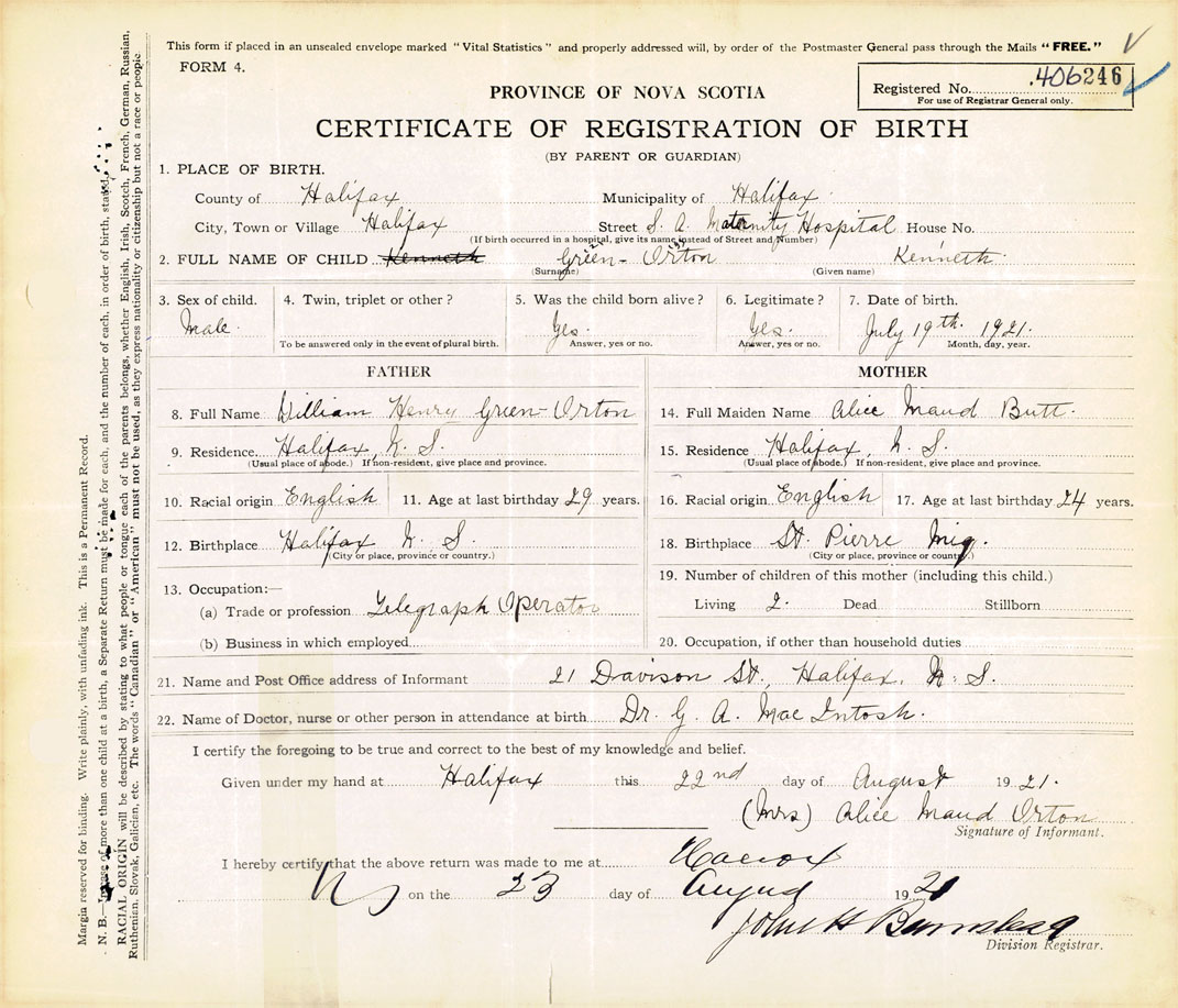 21. Name and Post Office address of Informant (Mrs.) ALice Maud Orton 21 Davison St., Halifax