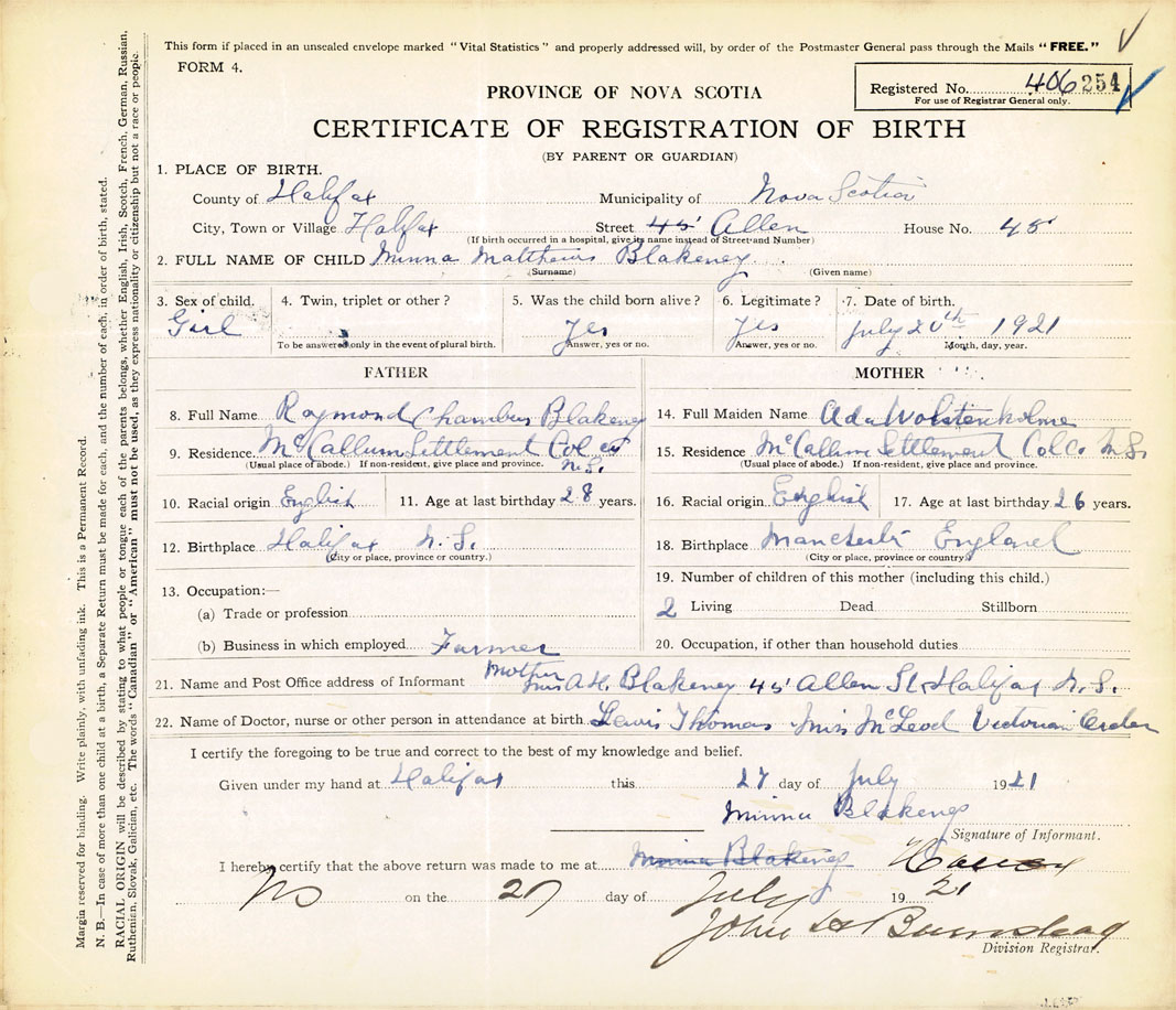 21. Name and Post Office address of Informant Mother Mrs. A. H. Blakeney 45 Allen St., Halifax