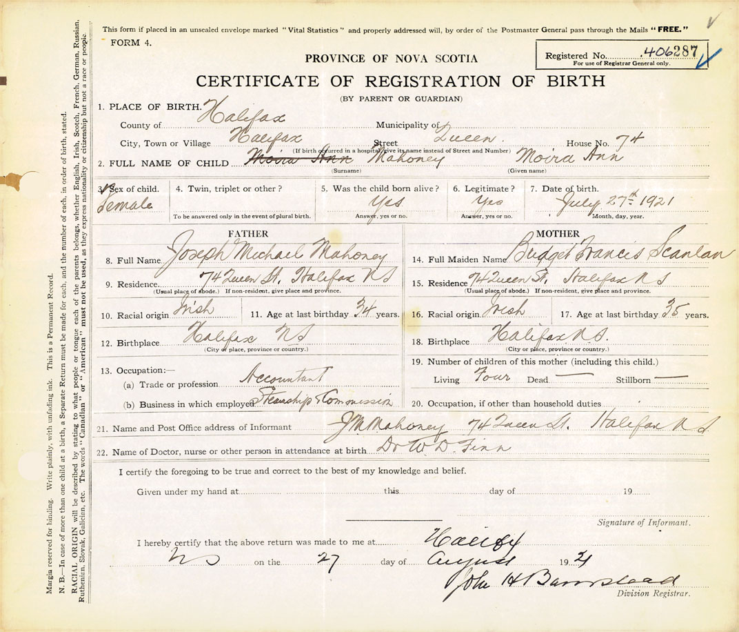 21. Name and Post Office address of Informant J.M. Mahoney 74 Queen St., Halifax