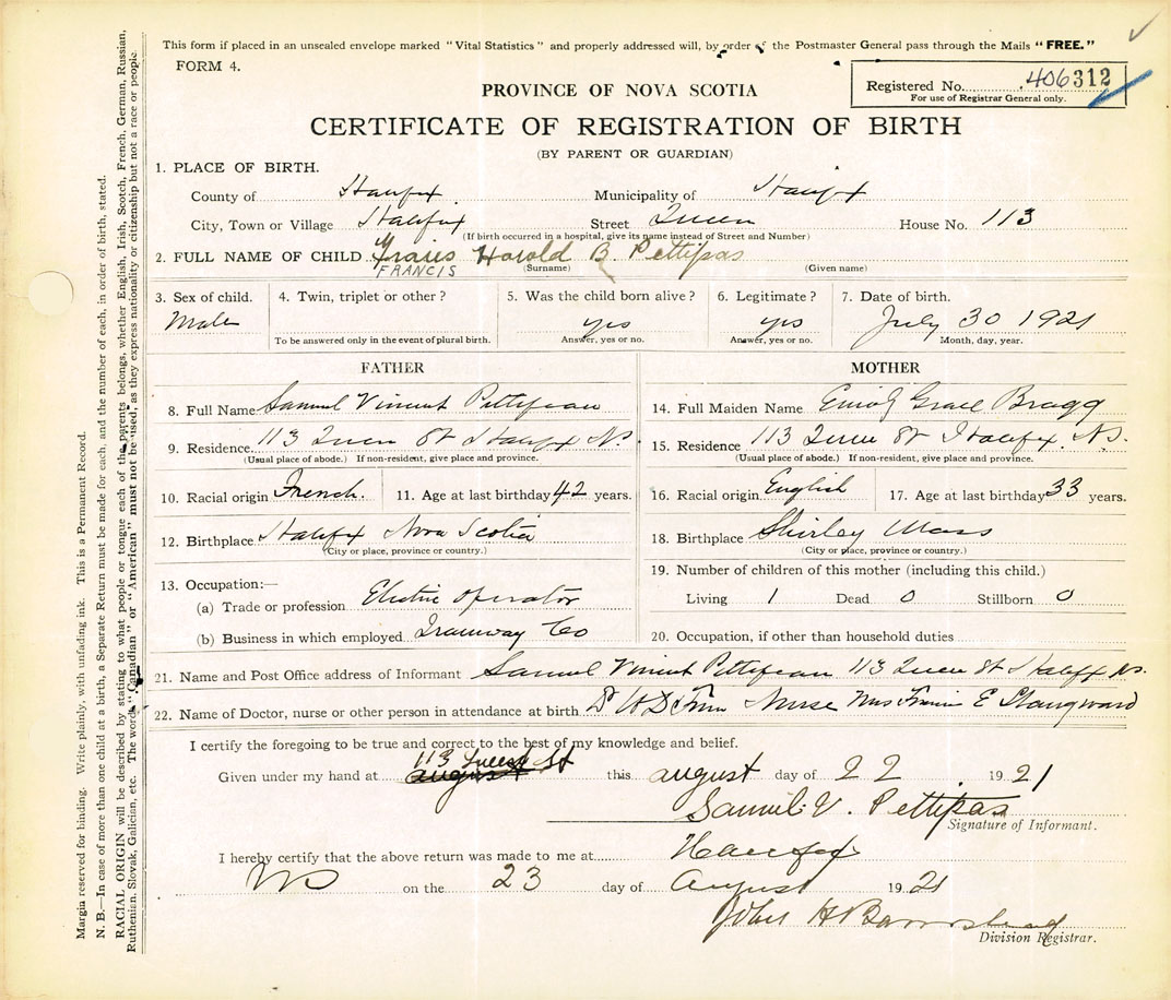 21. Name and Post Office address of Informant Samuel Vincent Pettipas 113 Queen St., Halifax, N.S.
