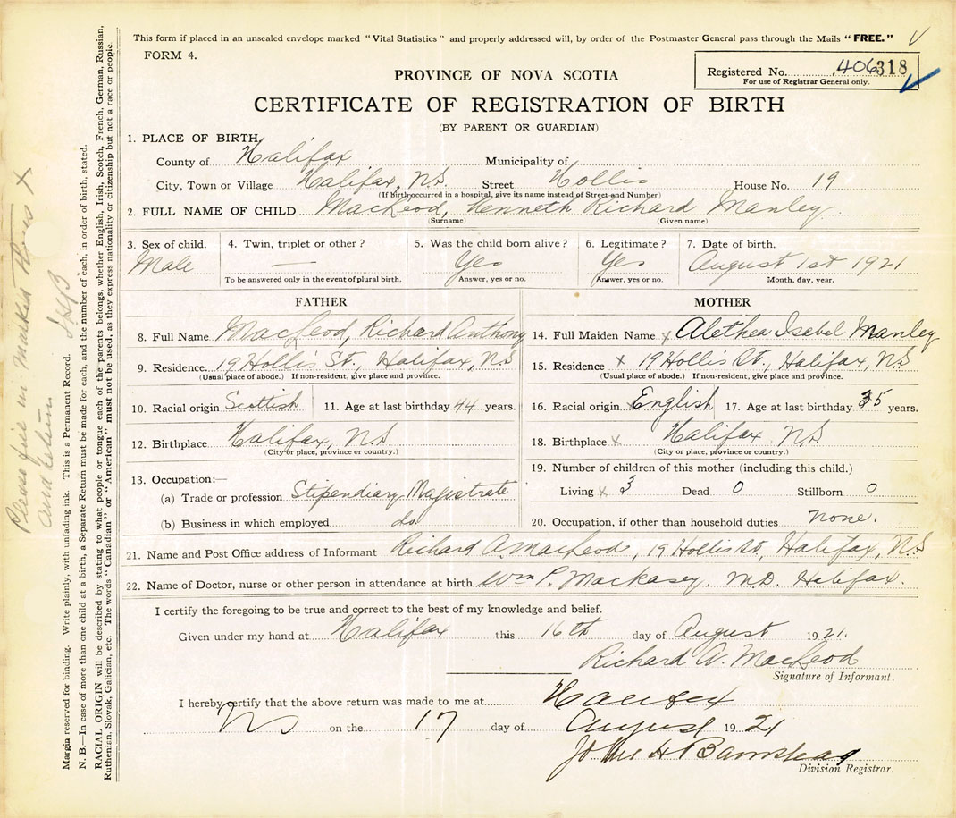 21. Name and Post Office address of Informant Richard A. MacLeod 19 Hollis St., Halifax, N.S.