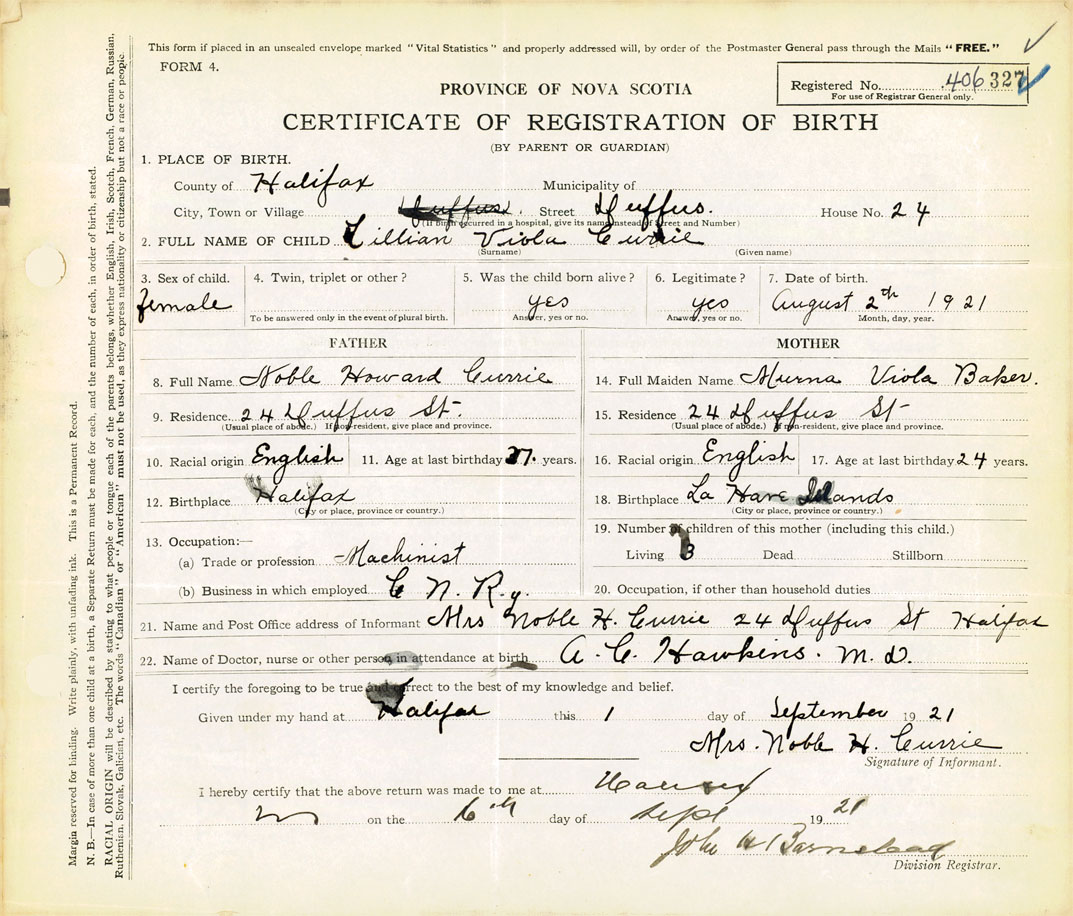21. Name and Post Office address of Informant Mrs. Noble H. Currie 24 Duffus St., Halifax