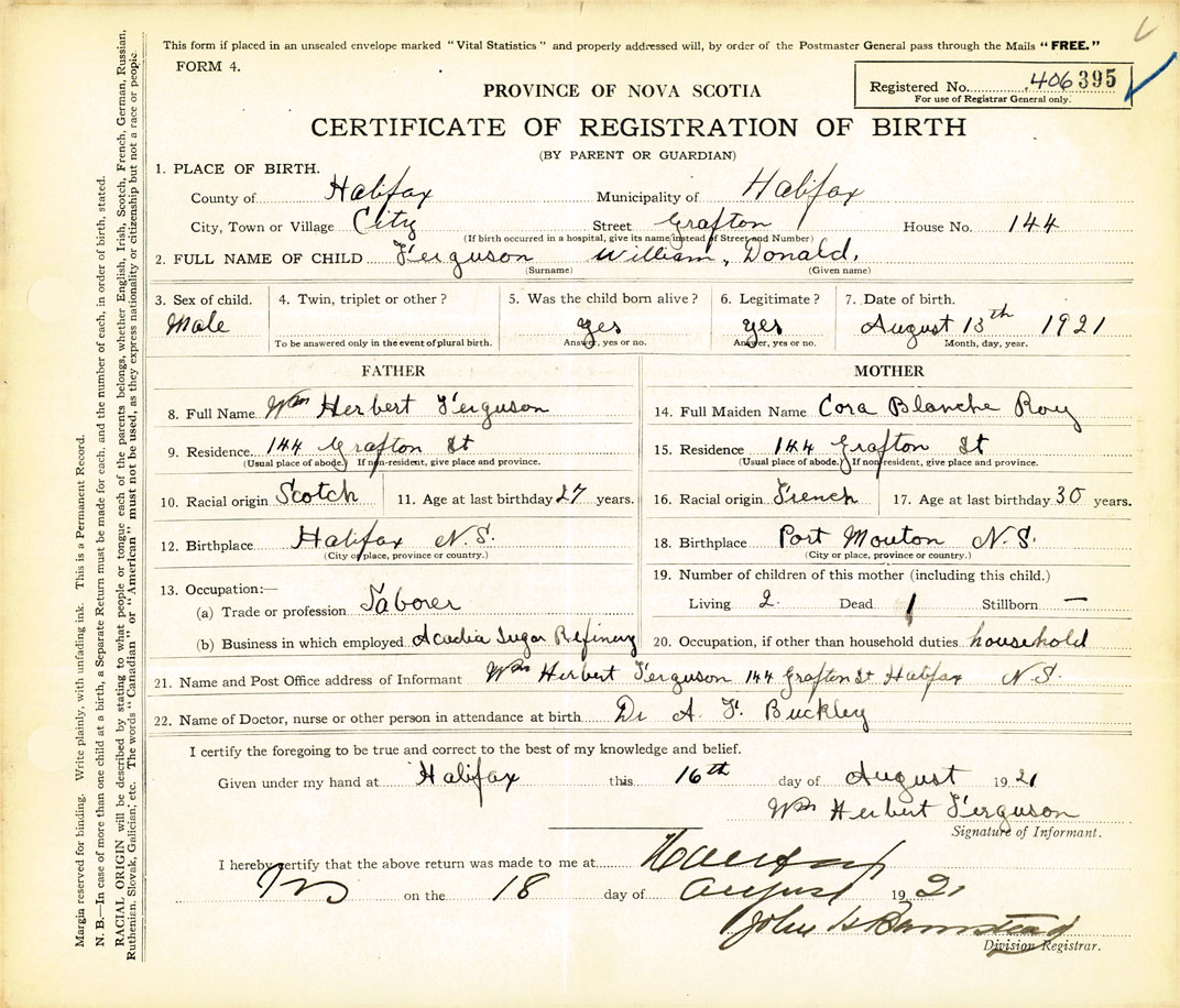 21. Name and Post Office address of Informant Wm. Herbert Ferguson 144 Grafton St., Halifax