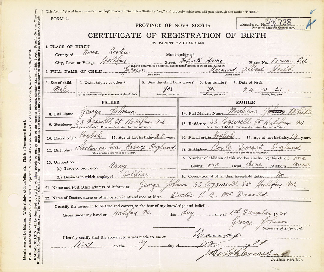 21. Name and Post Office address of Informant George Johnson 33 Cogswell St., Halifax, NS