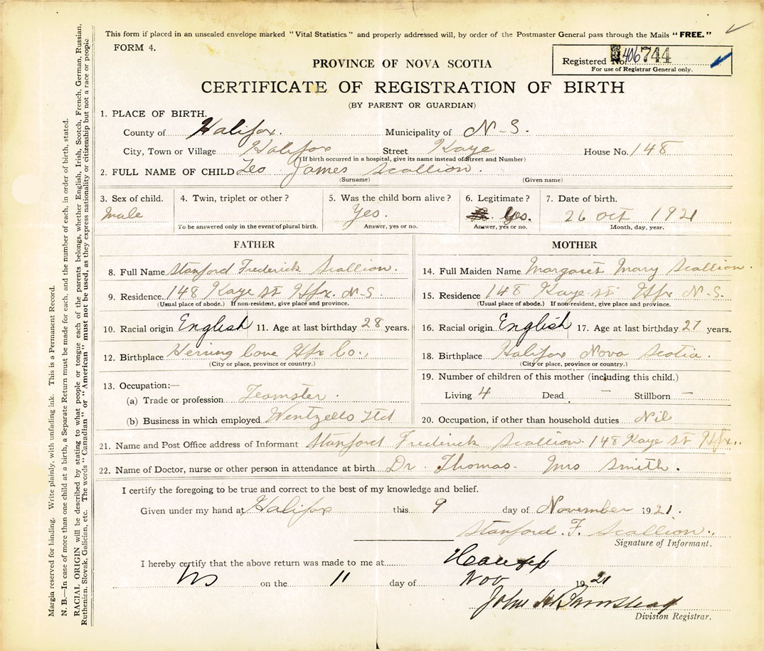 21. Name and Post Office address of Informant Stanford Frederick Scallion 148 Kaye St., Halifax