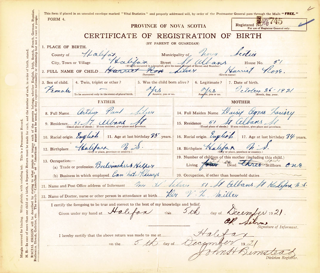 21. Name and Post Office address of Informant A. P. Silver 51 St. Albans St., Halifax, N.S.