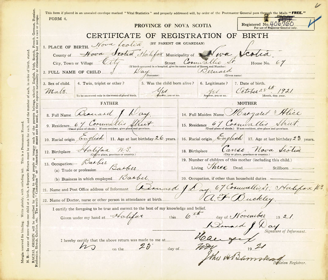 21. Name and Post Office address of Informant Bernard J. Day 67 Cornwallis St., Halifax, N.S.