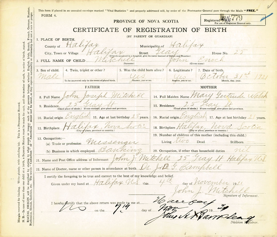 21. Name and Post Office address of Informant John J. Mitchell 25 Gray St., Halifax, N.S.