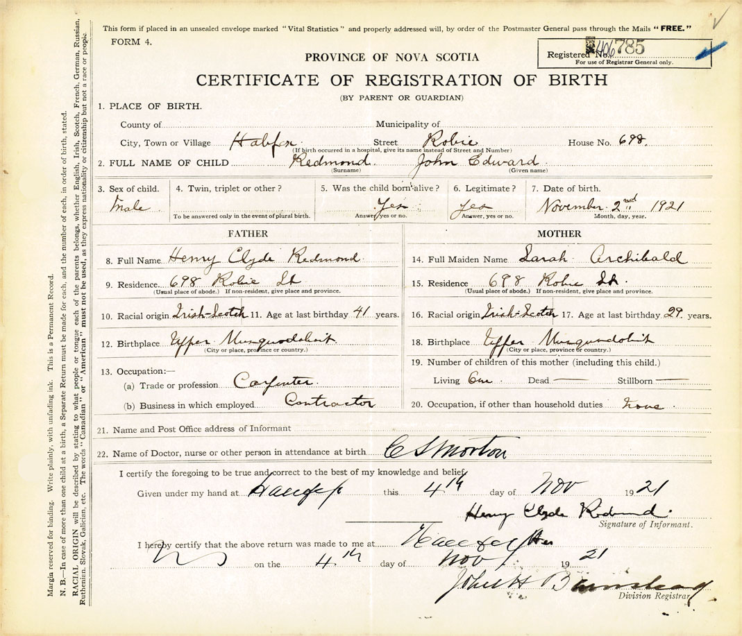 21. Name and Post Office address of Informant Henry Clyde Redmond 698 Robie Street, Halifax