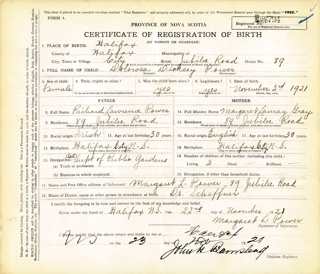 21. Name and Post Office address of Informant Margaret L. Power 89 Jubilee Road, Halifax