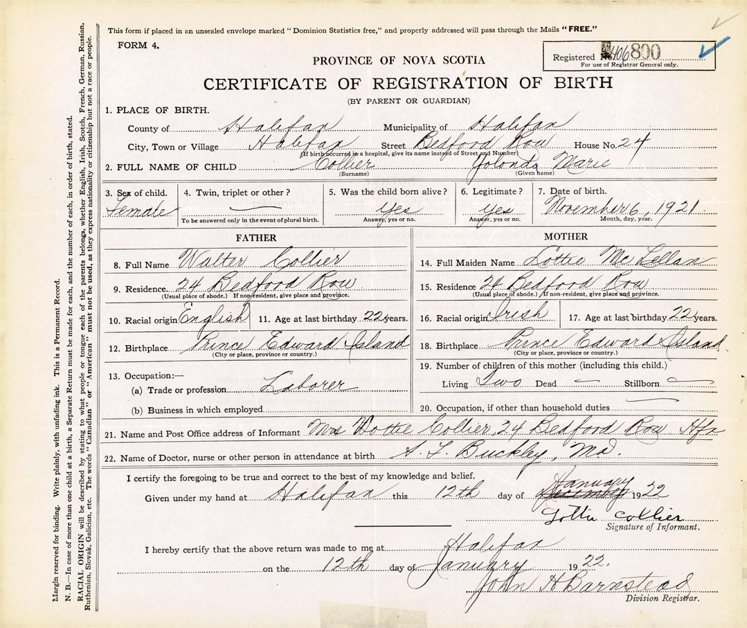 21. Name and Post Office address of Informant Mrs. Lottie Collier 24 Bedford Row, Halifax