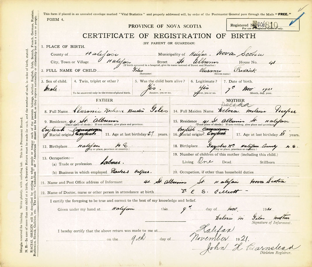 21. Name and Post Office address of Informant Delora M. Giles 41 St. Albans St., Halifax, Nova Scotia