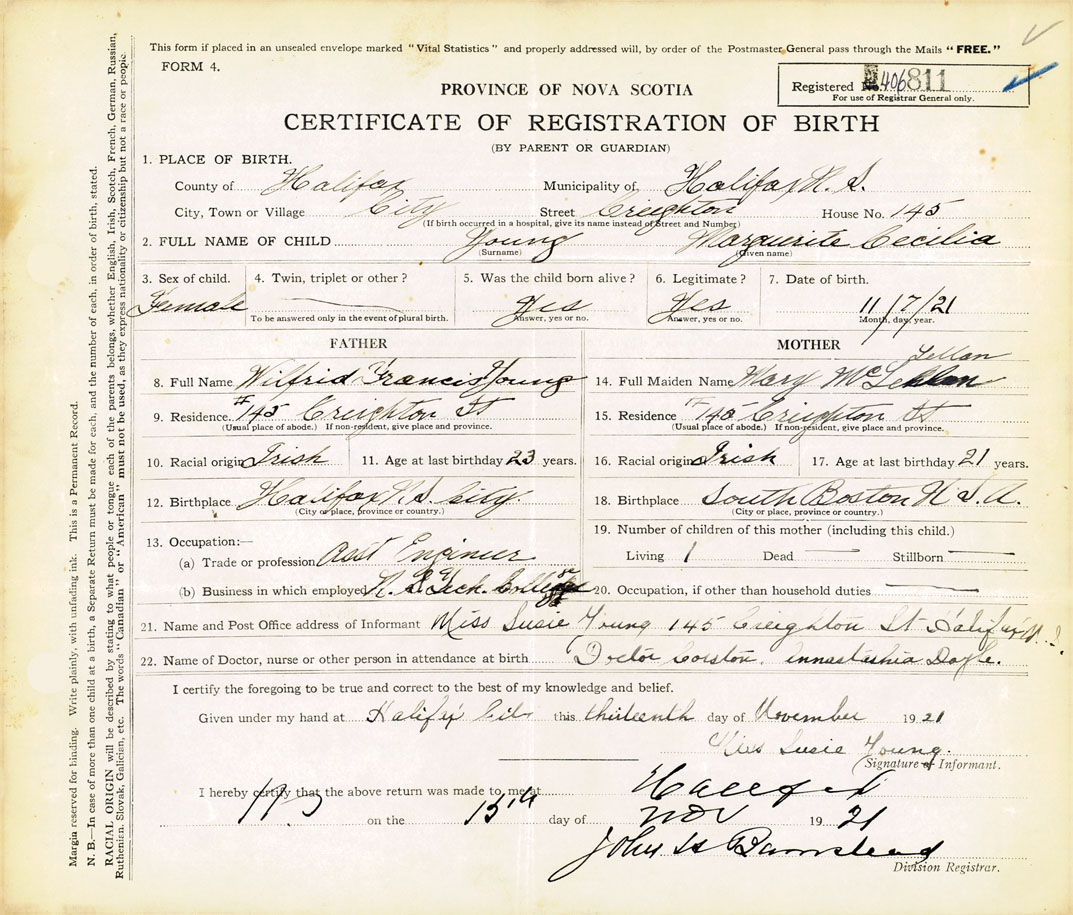 21. Name and Post Office address of Informant Miss Susie Young 145 Creighton St., Halifax, N.S.