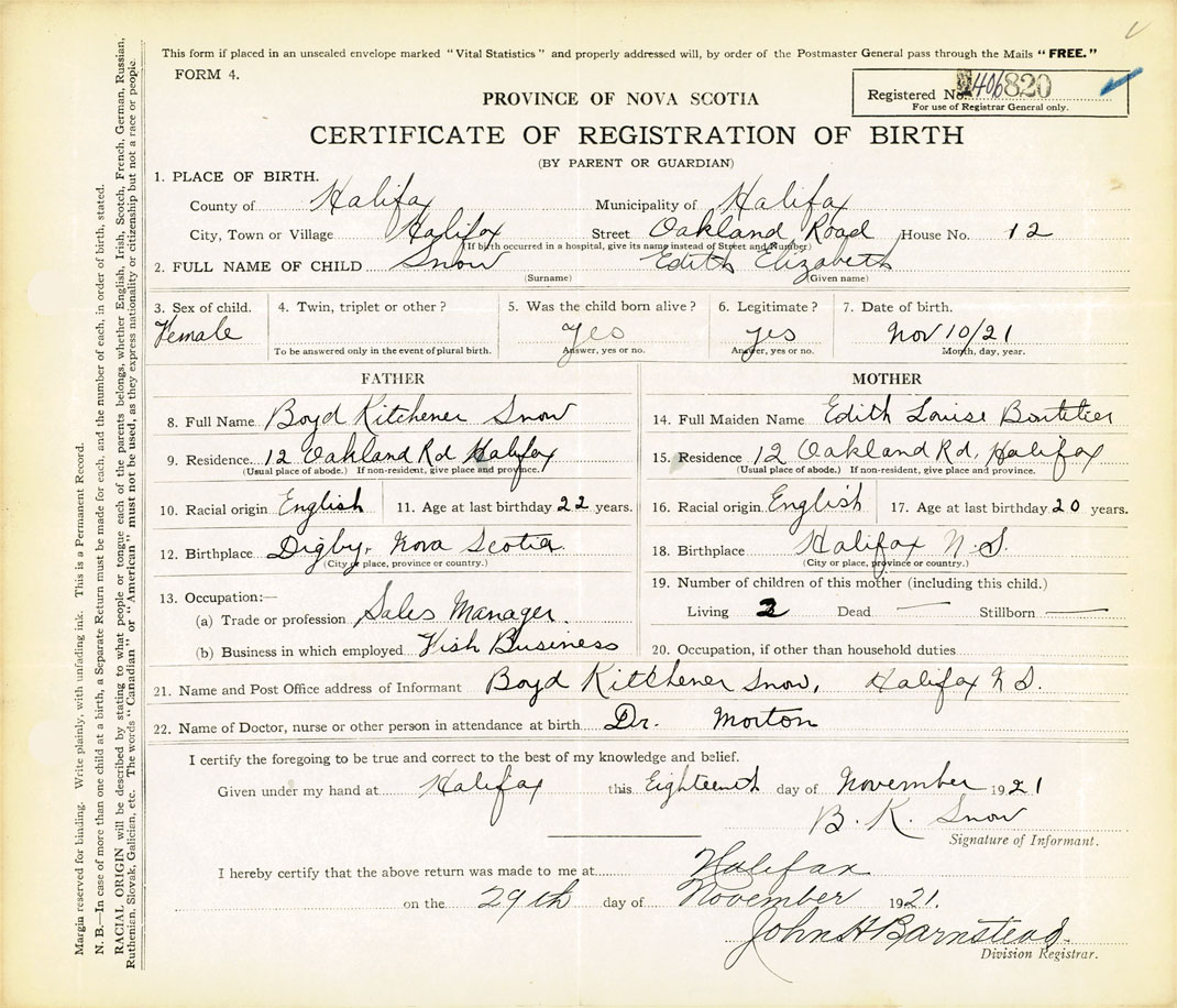 21. Name and Post Office address of Informant Boyd Kitchener Snow Halifax, N.S.