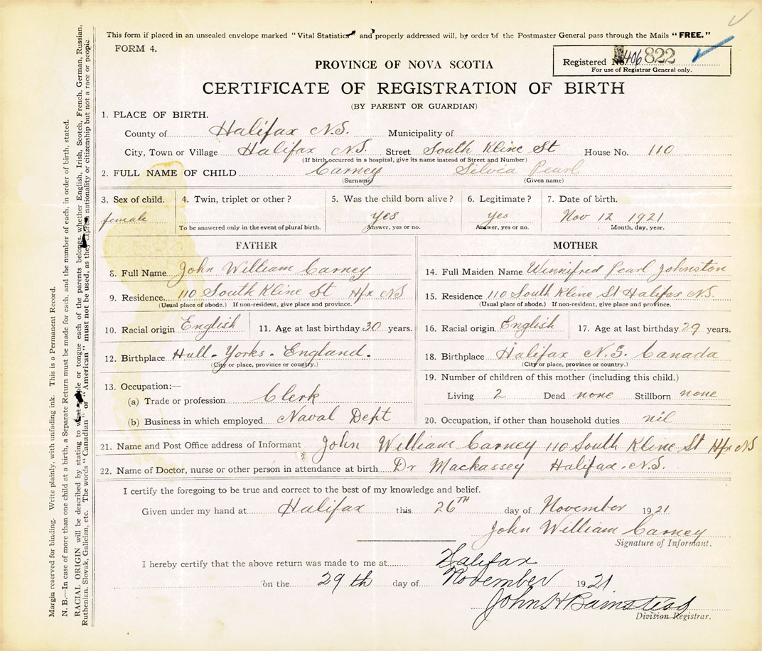 22. Name of Doctor, nurse or other person in attendance at birth Dr. Mackassey, Halifax, N.S.