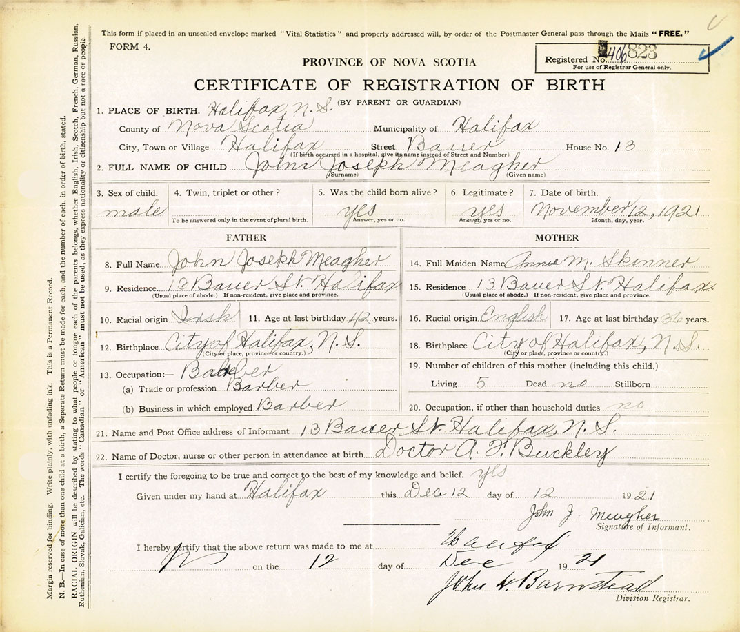 21. Name and Post Office address of Informant John J. Meahger 13 Bauer St., Halifax, N.S.