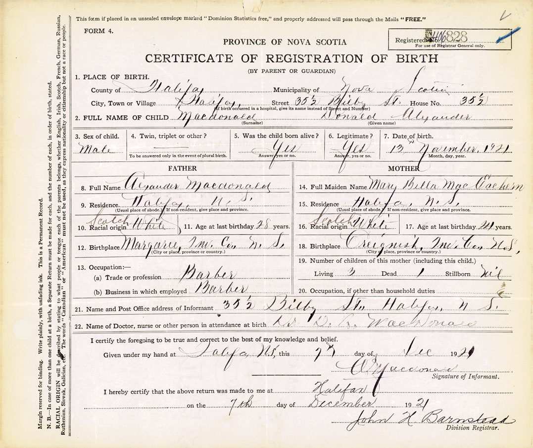 21. Name and Post Office address of Informant A. MacDonald 35 1/2 Bilby St., Halifax, N.S.
