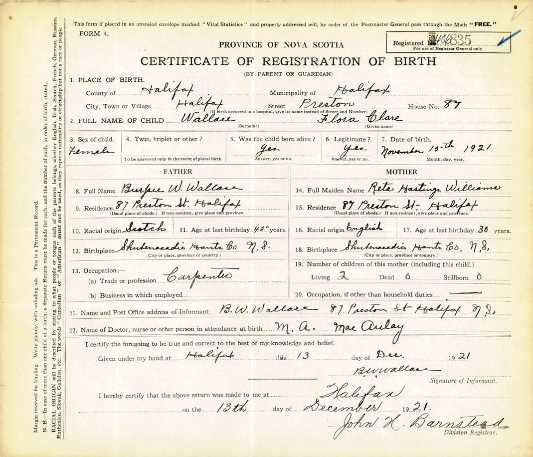21. Name and Post Office address of Informant B. W. Wallace 87 Preston St., Halifax, N.S.